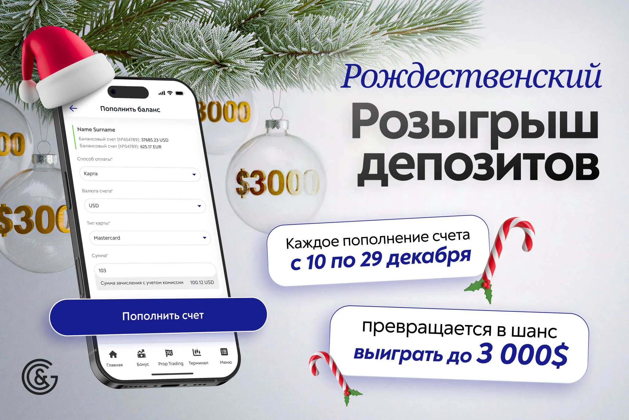 - С 10 по 29 декабря пополняй счет от $100 — и ты автоматически участвуешь в розыгрыше денежных призов.